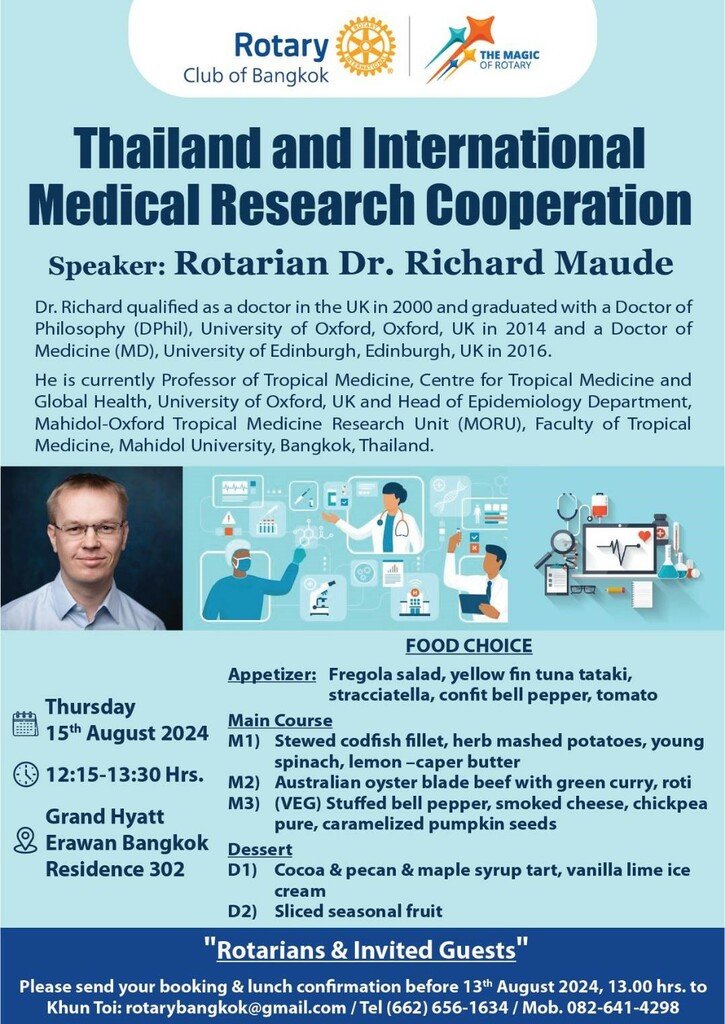 Dear All, Kindly be invited to the 6th RCB weekly lunch meeting on Thursday 15 August, 2024 as per the above details. Please confirm your attendance and your choice of main course (M1/M2/M3) and dessert (D1/D2) to me by Tuesday 13 August, 2024 by 13:00 hrs. for proper arrangement. With warm regards, Valaiporn (Toi) Executive Secretary The […]