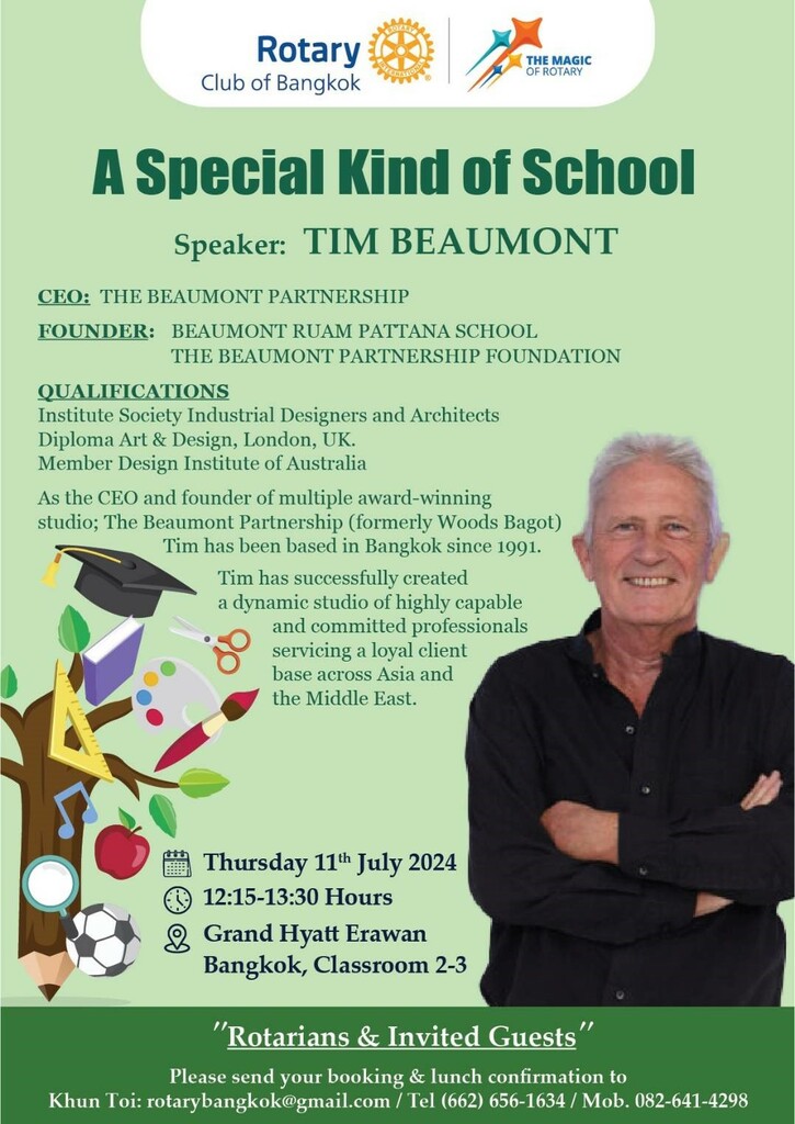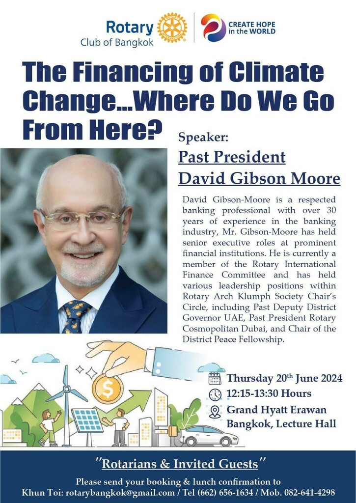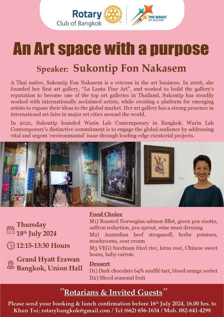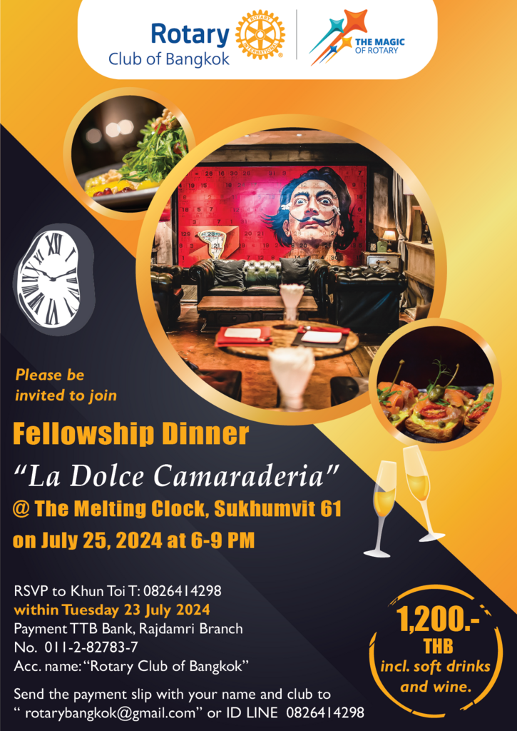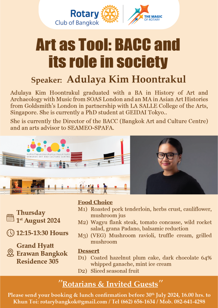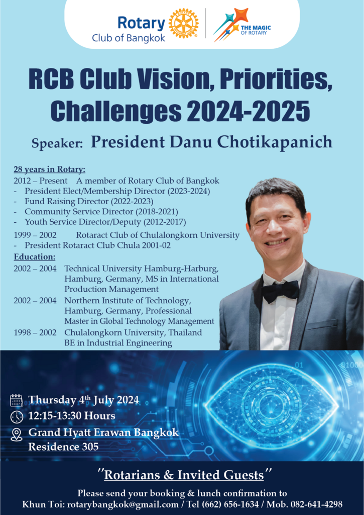 Dear All, Kindly be invited to the 4th RCB weekly lunch meeting on Thursday 1 August, 2024 Please confirm your attendance and your choice of main course (M1/M2/M3) and dessert (D1/D2) to me by Tuesday 30 July, 2024 by 16:00 hrs. for proper arrangement. With warm regards, Valaiporn (Toi) Executive Secretary The Rotary Club […]