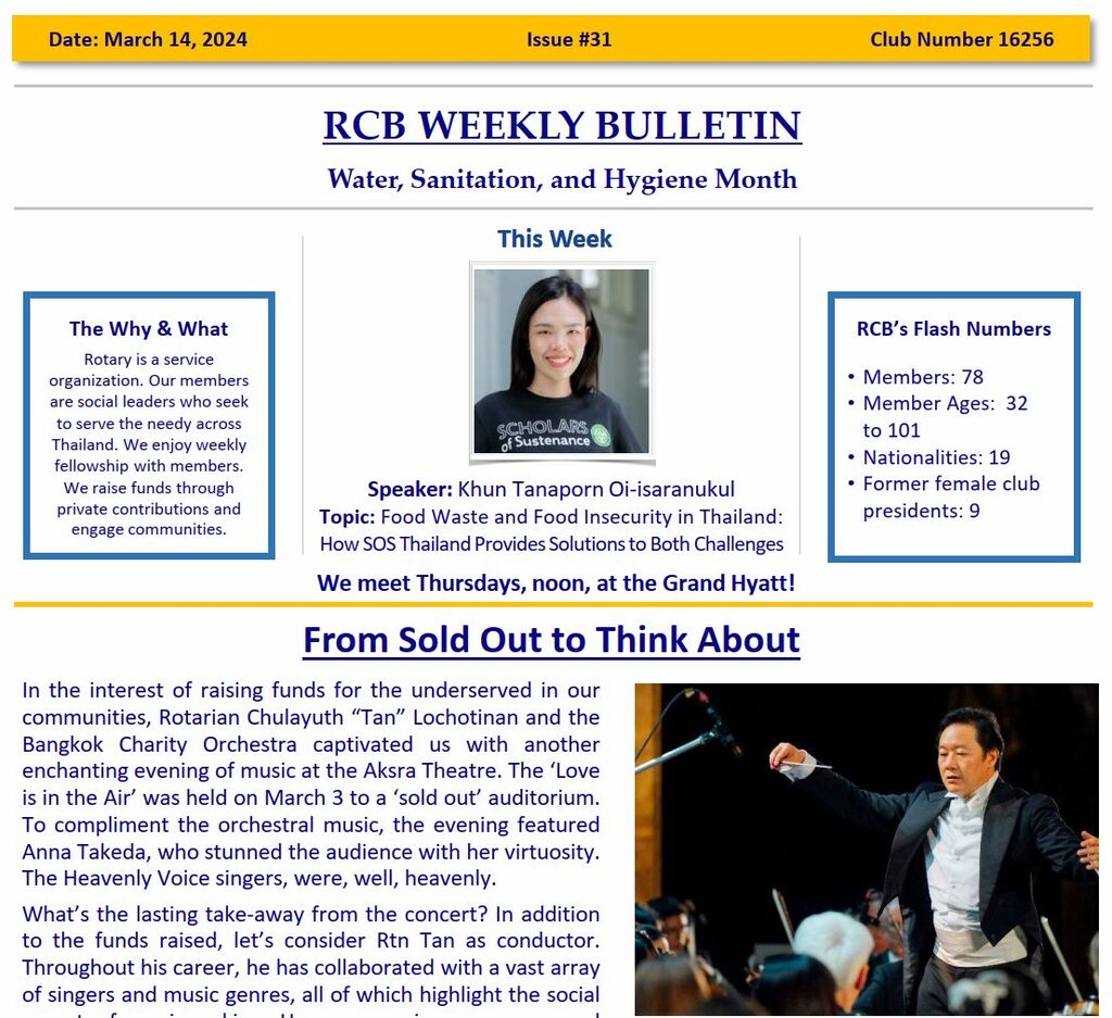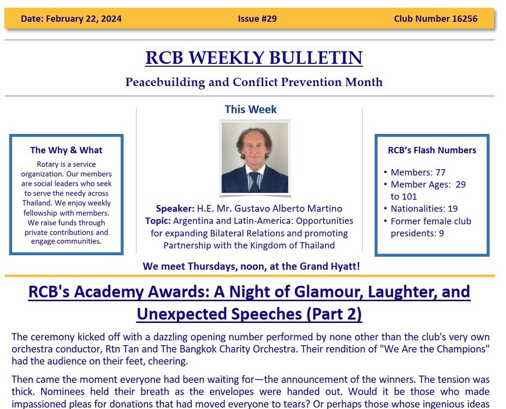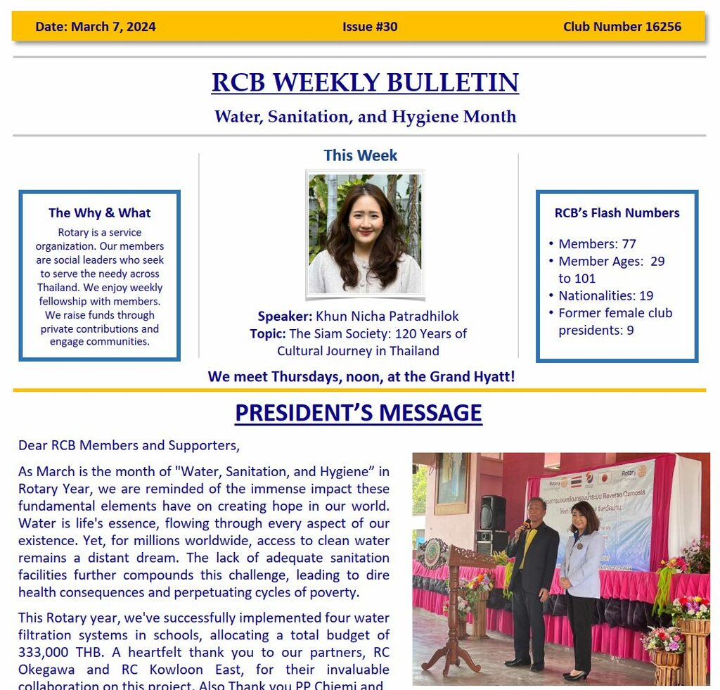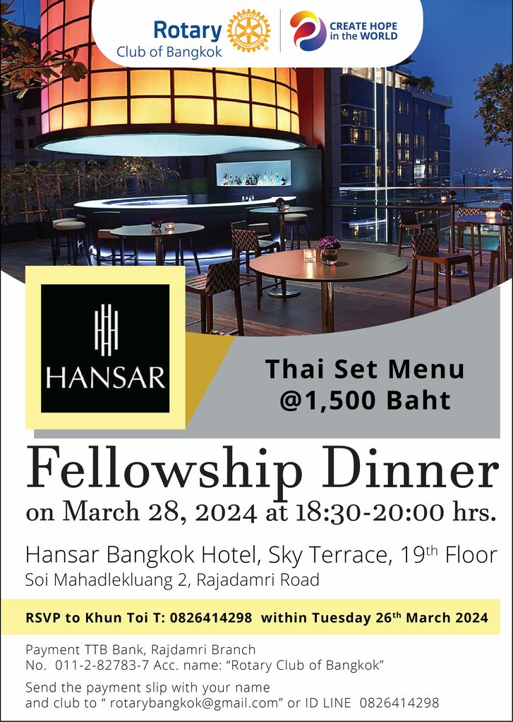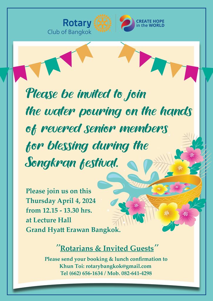 Dear All, In conjunction with Songkran festival (Thai traditional New Year), we would like to invite you to “Water Blessing for RCB Senior Members who are over 80 years” during the lunch meeting on Thursday, April 4, 2024. MENU Soup: Sweet corn chowder, celery, carrot, spicy oil, crispy polenta chips Main Course: M1) […]