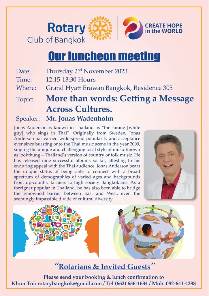 Dear RCB Members, Kindly be invited to #17th RCB Weekly Luncheon Meeting with the following details. Speaker: Mr. Jonas Wadenholm Topic: More than words: Getting a Message Across Cultures (see flyer attached for more details) Date: Thursday 2nd November, 2023 Time: 12:15 -13:30 hrs. Venue: Grand Hyatt Erawan Hotel, Residence 305 Appetizer: Avocado & crab salad, lemon, garlic aioli Main course: Opt […]