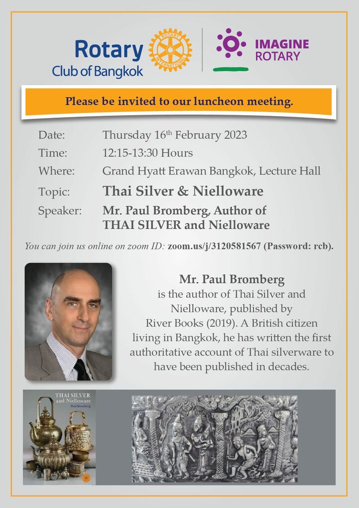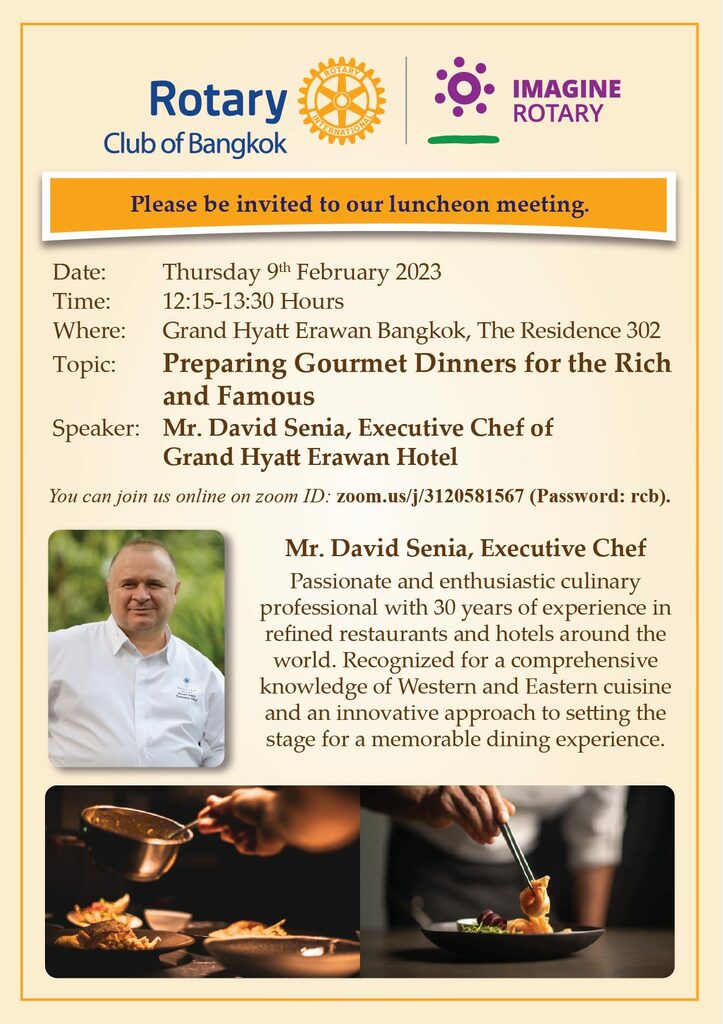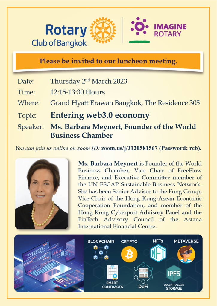 Dear RCB members, You’re invited to join 29th RCB Weekly Luncheon Meeting as per following information: Date: Thursday 2nd March, 2023 Time: 12.15 – 13.30 hrs. Where: Grand Hyatt Erawan Bangkok, the residence 305 Topic: Entering web 3.0 economy Speaker: Ms. Barbara Meynert, Founder of the World Business Chamber Main Course: Opt. 1: […]