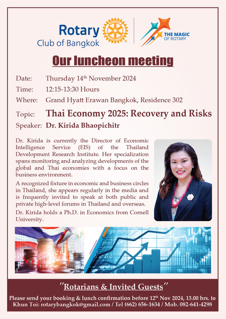 Dear All, Kindly be invited to the 16th RCB weekly lunch meeting on Thursday 7 November, 2024. With warm regards, Valaiporn (Toi) Executive Secretary Rotary Club of Bangkok