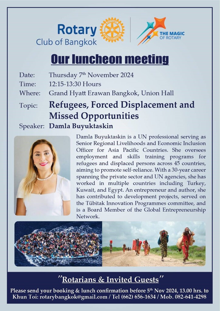 Dear All, The highlight on this day is the visit of our District Governor, Patsri Suwimol, who will provide a special talk to all of us. Let’s join us to welcome her. With warm regards, Valaiporn (Toi) Executive Secretary Rotary Club of Bangkok